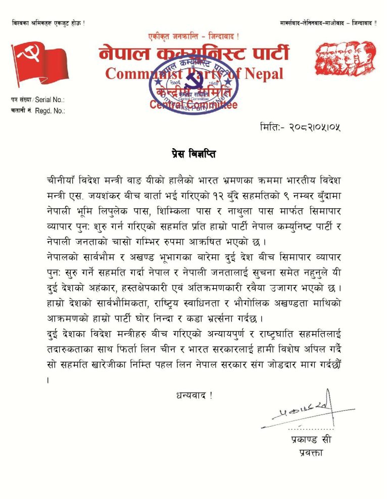 उक्त सहमतिको विषयमा नेपाल कम्युनिस्ट पार्टीले कडा आपत्ति जनाएको छ । पार्टीले विज्ञप्ति जारी गर्दै नेपाल र नेपाली जनतालाई जानकारी नै नदिई नेपालको सार्वभौम भूभाग प्रयोग गरी व्यापार पुनः सुरु गर्ने सहमति गर्नु चीन र भारत दुवै देशको “अहंकारी, हस्तक्षेपकारी र अतिक्रमणकारी प्रवृत्ति” भएको ठहर गरेको छ ।