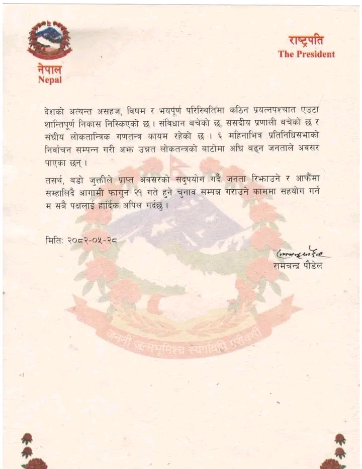 राष्ट्रपति रामचन्द्र पौडेलले आज जारी गरेको अपीलमार्फत संविधान, संसदीय प्रणाली र संघीय लोकतान्त्रिक गणतन्त्रलाई सुरक्षित राख्न सबैलाई आह्वान गरेका छन्। उहाँले प्रतिनिधिसभा निर्वाचन सम्पन्न गरी अझ सुदृढ लोकतन्त्रको बाटोमा अघि बढ्न जनतालाई अवसर प्राप्त भएको उल्लेख गर्नुभयो।