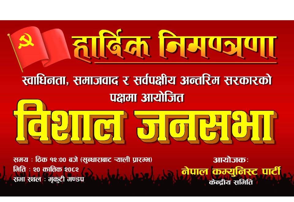 नेपाल कम्युनिष्ट पार्टीले आज बिहीबार काठमाडौँको भृकुटीमण्डपमा बृहत् जनसभा आयोजना गर्दैछ। गत असोज २६ देखि ३० गतेसम्म सम्पन्न नवौँ केन्द्रीय समितिको तेस्रो विशेष बैठकले देशव्यापी जनसंघर्ष गर्ने निर्णय गरेअनुसार यो जनसभा सञ्चालन हुन लागेको जानकारी दिएको छ ।