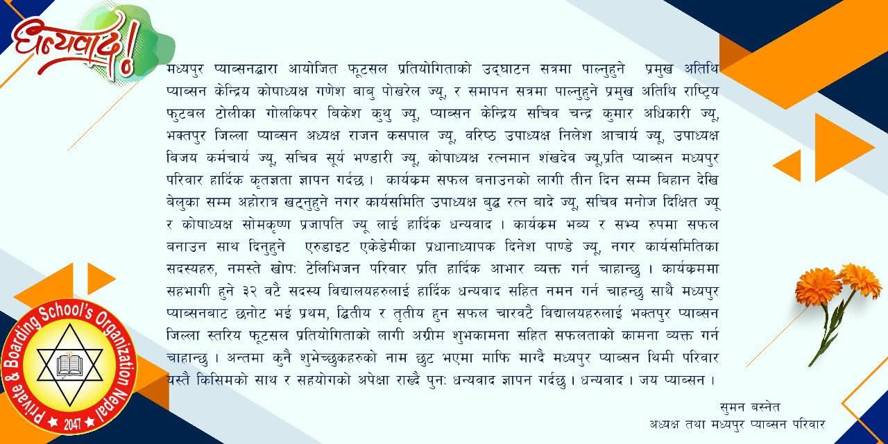 प्रतियोगितामा सहभागी ३२ वटै सदस्य विद्यालयलाई आयोजक मध्यपुर प्याब्सनले हार्दिक धन्यवाद ज्ञापन गर्दै नमन गरेको छ। साथै मध्यपुर प्याब्सनबाट छनोट भई प्रथम, द्वितीय र तृतीय स्थान हासिल गर्न सफल चारवटै विद्यालयलाई भक्तपुर प्याब्सन जिल्ला स्तरीय फूटसल प्रतियोगितामा सहभागी हुँदै अझ उत्कृष्ट प्रदर्शन गर्न अग्रीम शुभकामना दिएको छ।