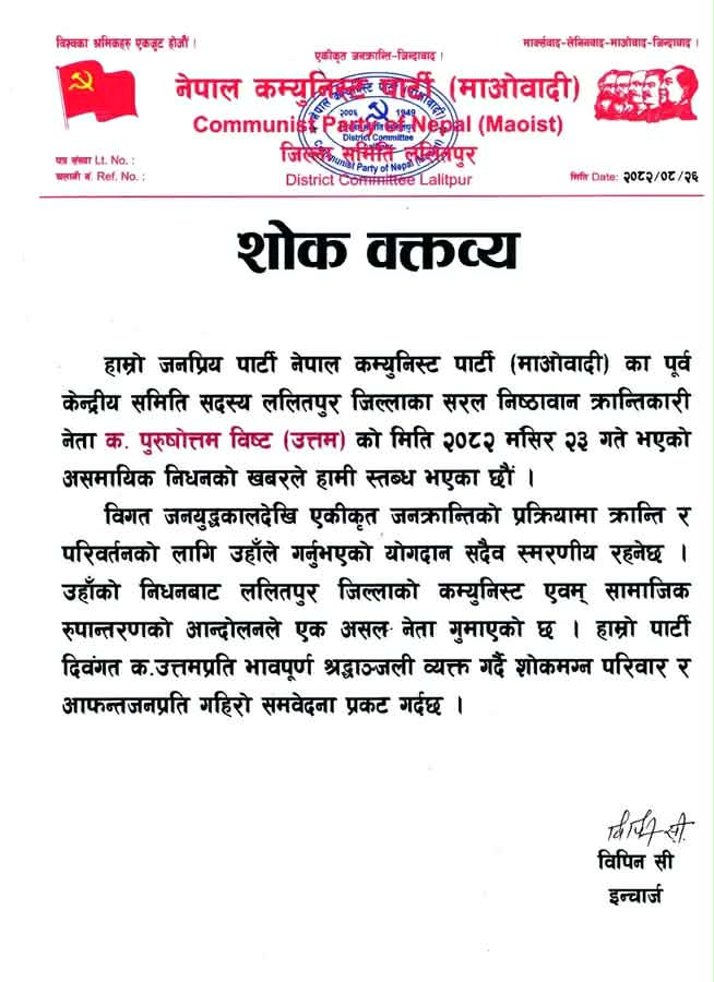 जिल्ला इन्चार्ज विपिन सीद्वारा हस्ताक्षरित शोक वक्तव्यमा भनिएको छ,
