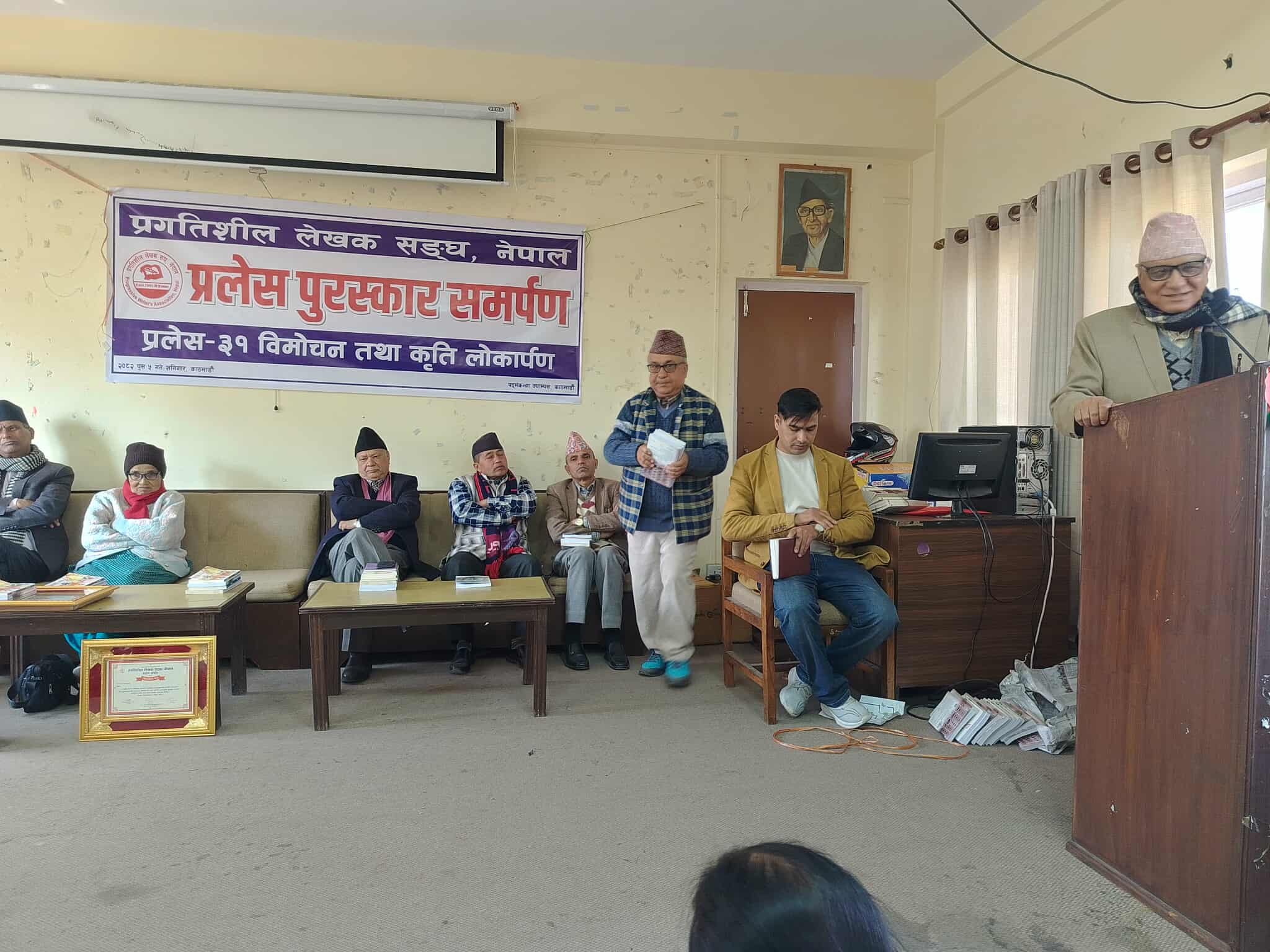 प्रलेस अध्यक्ष देवी क्षेत्री दुलालको अध्यक्षता तथा महासचिव झपिन्द्र ढकाल (पारस) को सञ्चालनमा सम्पन्न कार्यक्रममा प्रलेसका पूर्व अध्यक्ष, सल्लाहकार तथा सम्मानित स्रष्टाहरूले समेत मन्तव्य राखेका थिए।