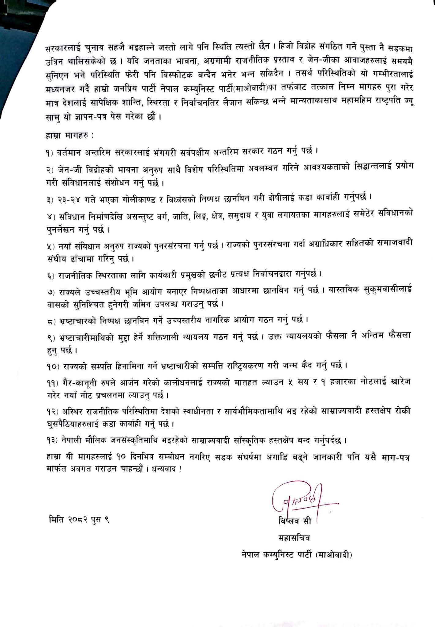 २३–२४ गते भएका गोलीकाण्ड र हिंसात्मक घटनाको निष्पक्ष छानबिन गरी दोषीमाथि कडा कारबाही गर्न माग गरिएको छ। संविधान निर्माणका क्रममा वर्ग, जाति, लिङ्ग, क्षेत्र, समुदाय र युवाहरूका अधिकार समेट्दै संविधान पुनर्लेखन गर्नुपर्ने माओवादीको धारणा छ।