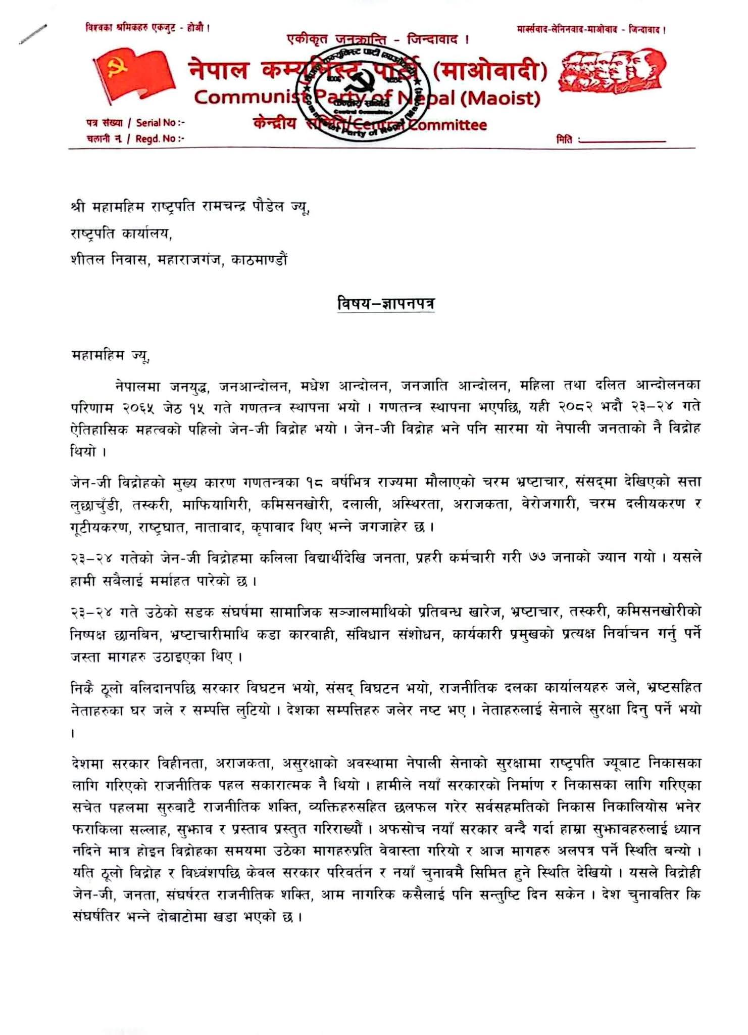 २०८२ पुस ९ काठमाडौँ । नेपाल कम्युनिष्ट पार्टी (माओवादी) ले वर्तमान राजनीतिक अवस्था, जनजीवनको सङ्कट र राज्य सञ्चालनमा देखिएको असफलताको उल्लेख गर्दै १३ बुँदे मागसहित राष्ट्रपतिलाई ज्ञापनपत्र बुझाएको छ। पार्टीका महासचिव विप्लव सीको हस्ताक्षरसहित पेस गरिएको ज्ञापनपत्रमा वर्तमान सरकार जनअपेक्षा पूरा गर्न असफल भएको ठहर गरिएको छ।