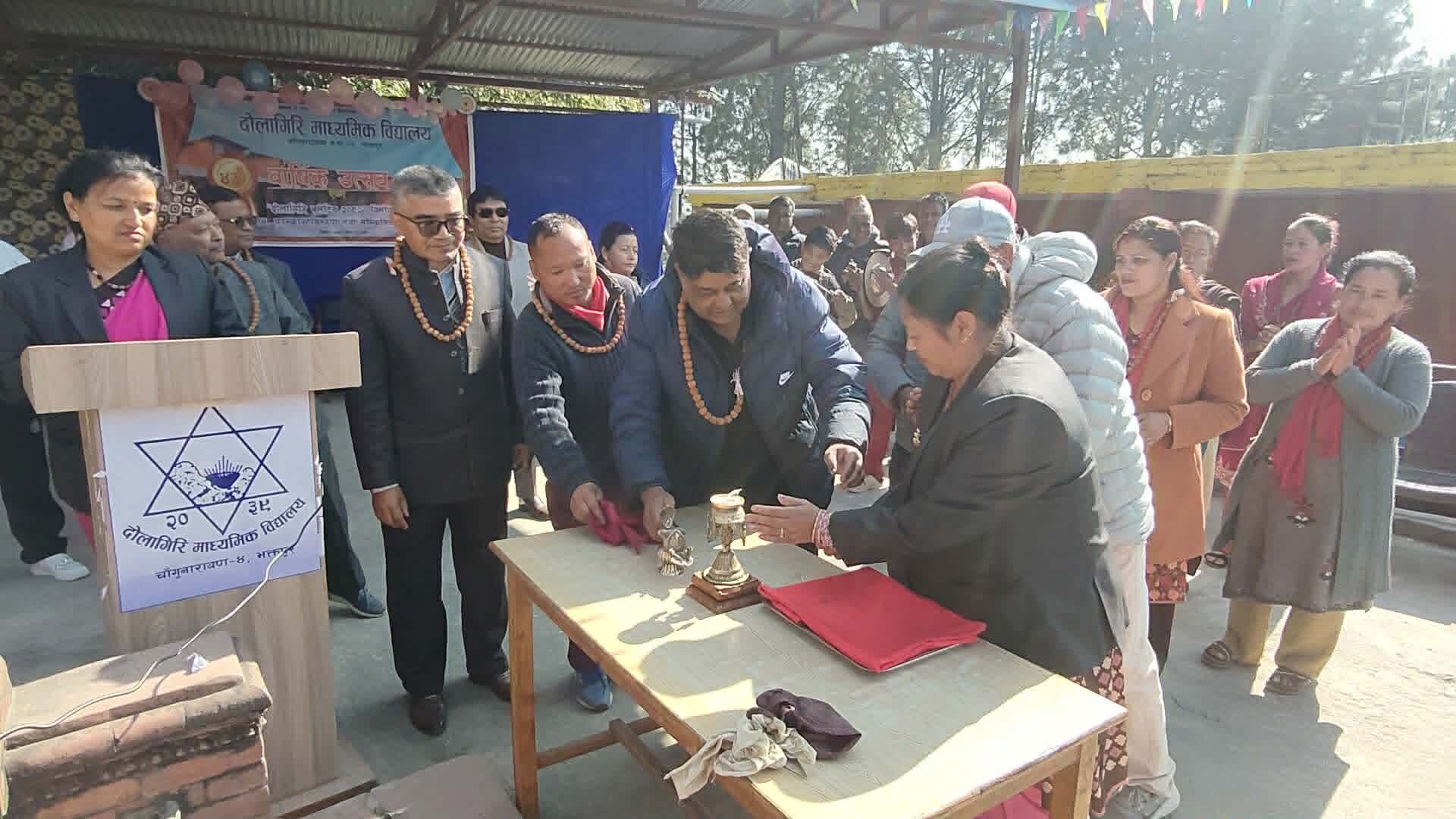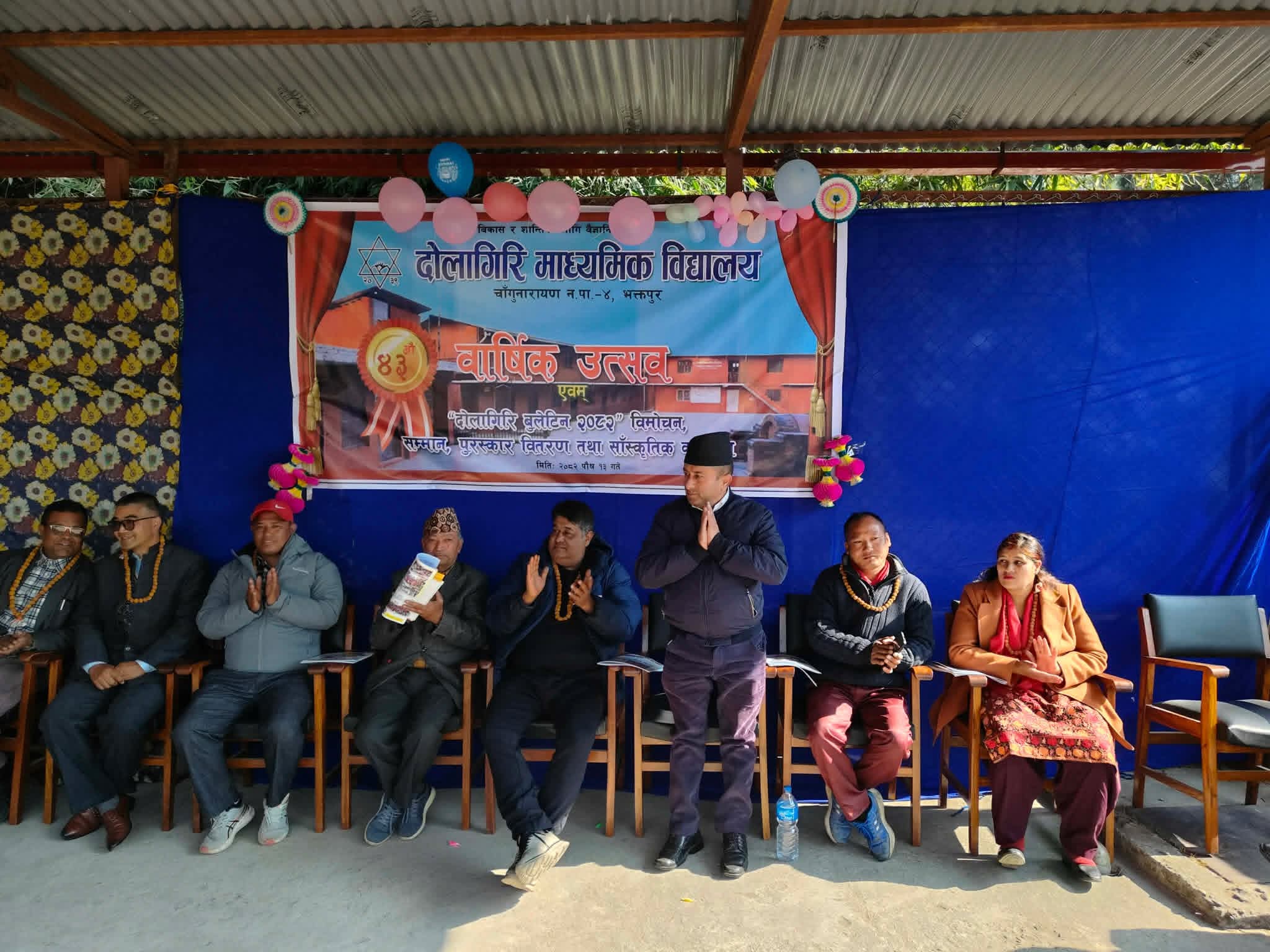भक्तपुर । चाँगुनारायण नगरपालिका–५, भक्तपुरस्थित दोलागिरि माध्यमिक विद्यालयको ४३ औँ वार्षिक उत्सव तथा ‘दोलागिरि बुलेटिन’ विमोचन, सम्मान तथा पुरस्कार वितरण समारोह भव्य रूपमा सम्पन्न भएको छ।